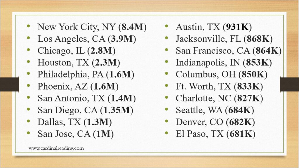 Therefore, in addition to dyslexics, we have struggling readers who present in the form of students from socially-challenged and economically deprived areas where resources are lacking, and we have burgeoning population of students for whom English is not their first language.  And they present their collective, smiling faces in our nation’s classrooms and schools each morning.  But think about what we are leaving on the table.  To further enforce this, remember that we have 55.2 million students in our educational system, Pre-K through 12th grade.  Again, check my math, but 63% of 55.2 million is 34.6 million students.  If we subtract the number of dyslexics (11,040,000) from the number of readers who read on the “basic” level (34,600,000), we are left with a grand total of 25,360,000 students who are struggling to decode the English language simply because teachers are unable to teach the science of reading.  Let’s dramatize this.  In order to reach a total of 34.6 million people, imagine each and every living person in the twenty largest cities in America, COMBINED!